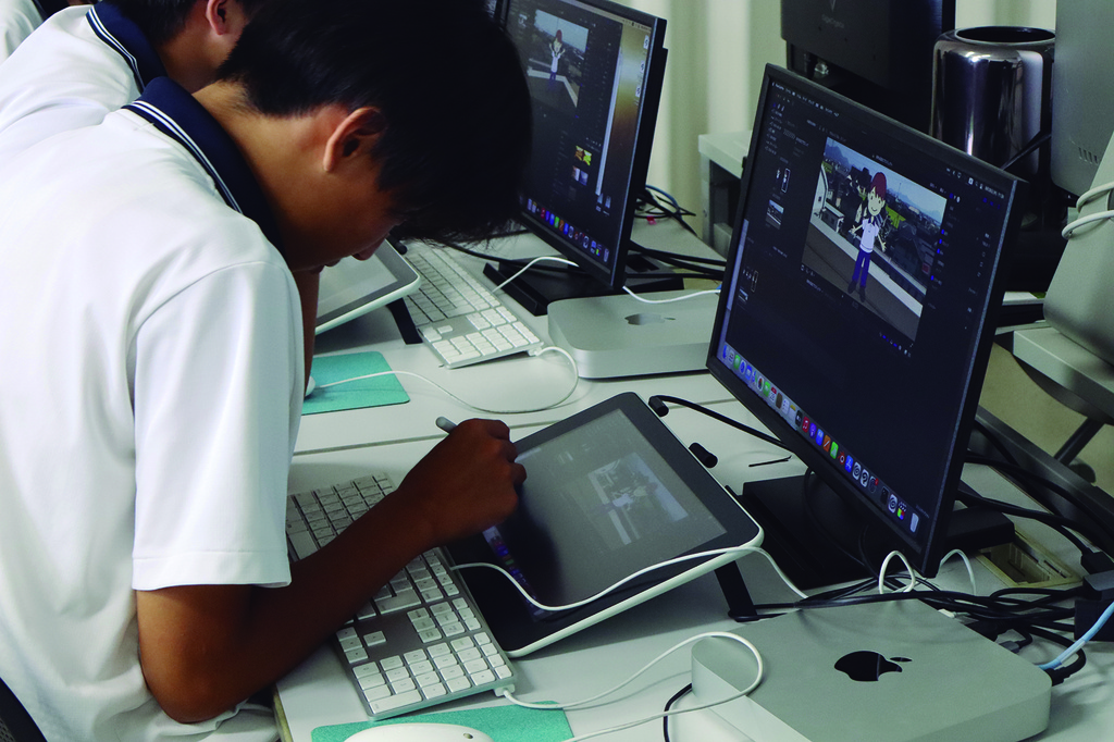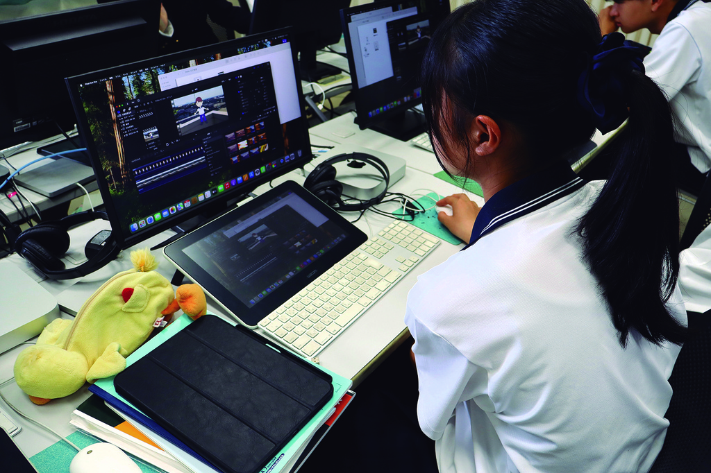 例えば美術では、「Mac mini」やワコムのペンタブレットを整備し、映像制作の授業などで活用している。取材した選択美術の授業では、映像編集ソフト「Final Cut Pro」やペイントソフト「CLIP STUDIO PAINT」を使いながら、レイヤーの概念や画像の変形や移動が簡単に行えるデジタルの強みを学んでいた。最終的にはクラスで一つのアニメーションを制作し、音楽や書道選択の生徒たちの制作物と組み合わせた合同発表会を実施する予定だ。音楽科では歌声合成ソフトウェア「VOCALOID」も導入しており、本ソフトで制作した音楽と、映像制作で作ったアニメーション、書道パフォーマンスを組み合わせるのだという。この美術の授業を担当した芳泉高校 情報企画課長 芸術科(美術)指導教諭の平尾教人氏は「1学期は日本画の制作を行いました。日本画は実際の風景やモチーフを目の前にして描くのではなく、自分が取材したスケッチを組み合わせて構成していきます。この沢山のスケッチからコラージュのように構成していく作業はデジタルの方がやりやすいのではないかと考え、その授業の中でペイントソフトを活用していました。今の授業で取り組んでいるアニメーションなども、レイヤーを重ねていく作業が江戸時代の浮世絵版画の版を重ねる作業と近いため、そういった授業への展開も視野に入れています」と語る。