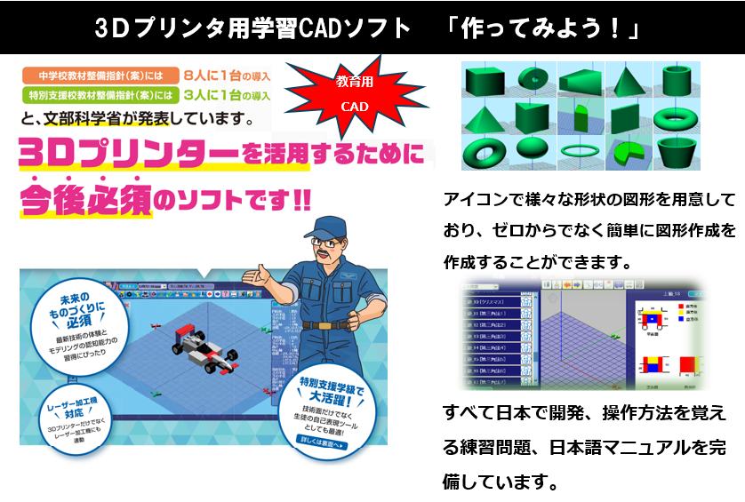 【オプション:3Dプリンタ用学習CADソフト:作ってみよう!(別途購入必要)】