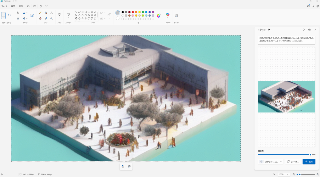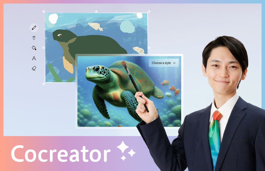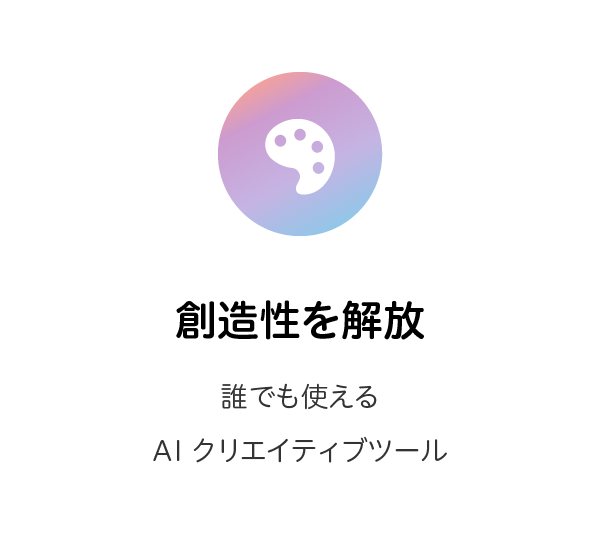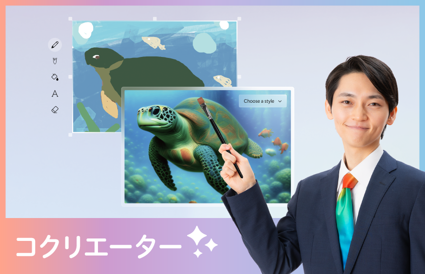 | デザインスキルがなくても、作りたい画像やポスターのアイデアはある | 「コクリエーター」を起動し、作りたい画像のイメージを文字(プロンプト)と簡単なスケッチでAI に伝える | AI が指示に基づき、著作権問題をクリアしたプロレベルの画像を複数パターン生成する | 気に入った画像を選択し、ポスターや資料に利用!権利の心配なく、安心して公開できる |