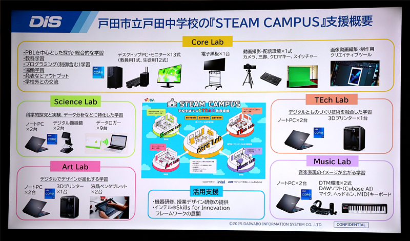 戸田市教育委員会は戸田市立戸田中学校において、複数の特別教室にICT機器を配置した「STEAM CAMPUS」を設置し、2025年11月11日に開設セレモニーを実施した。インテル、ダイワボウ情報システム(DIS)とともに取り組むSTEAM教育の在り方について見ていこう。